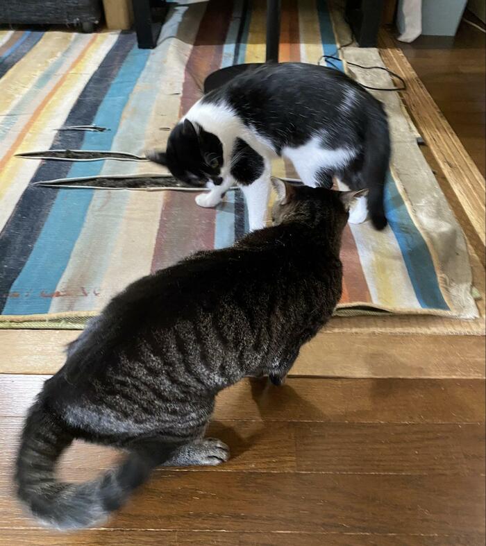 もう!俺を取り合うのは止めてくれよ〜!!!!!#嬉しい #どっちにも好かれたい #けど喧嘩はほどほどに #止めようとしたら手を引っ掻れた #何でやねん pic.twitter.com/uW5WfwUj5o