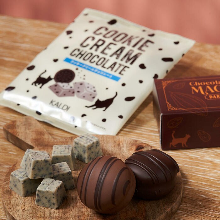 「チョコがけマカロン」は、ビターなダークチョコ味とクリーミーなナッツの風味を感じるプラリネクリーム味の2種。「クッキークリームチョコレート」は、ココアビスケットをたっぷりと練り込んだ、さくさく食感が楽しめます。