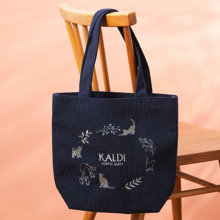 ネイビーのコーデュロイ生地に、可愛らしいネコの刺繍が入ったトートバッグです。マチが広く、たっぷり入るサイズ感が普段使いにもおすすめ。