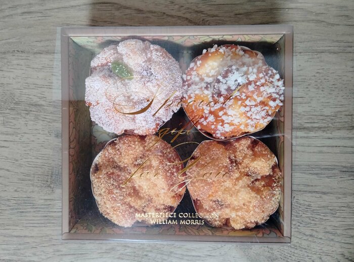 セリアの「ウィリアム・モリスのスリーブボックス」を実際に使ってみました。写真のように直径7cmのカップケーキを4つ入れることができました。