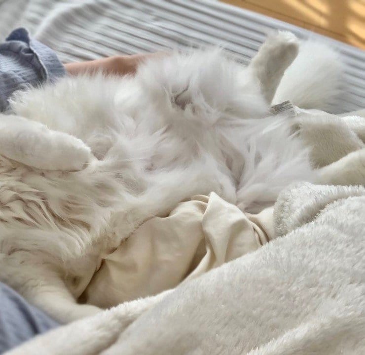 寄り添うマオくんはモコモコのお腹を大胆に見せていて、その様子に警戒心は微塵も感じられません。マオくんも安心しきっていることがうかがえて、自然と心が温まる瞬間でした。