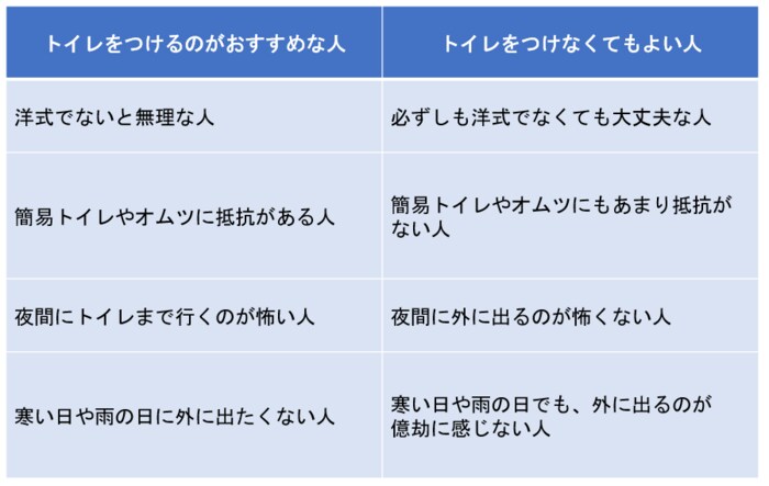 私たちがキャンピングカー仲間と議論した内容を踏まえ、キャンピングカーにトイレをつけた方がよい人・不要な人の特徴をまとめます。