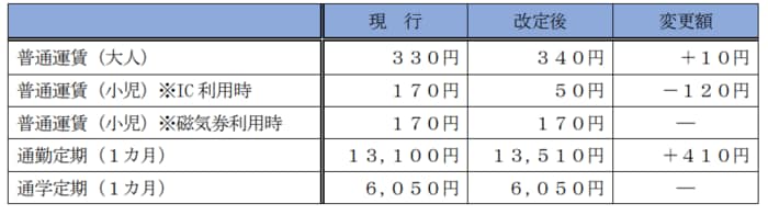大人の普通運賃の場合、当該区間では10円の引き上げで340円となります。