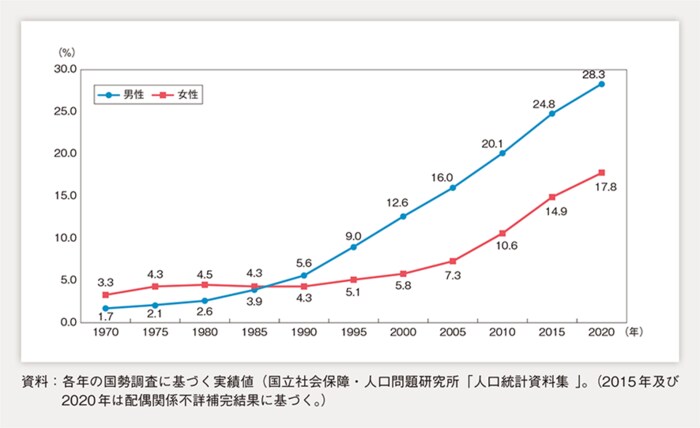 そして2020年には男性28.3%、女性17.8%とさらに上昇しています。男性でおよそ3割、女性でおよそ2割の人が生涯未婚であることが想定されます。