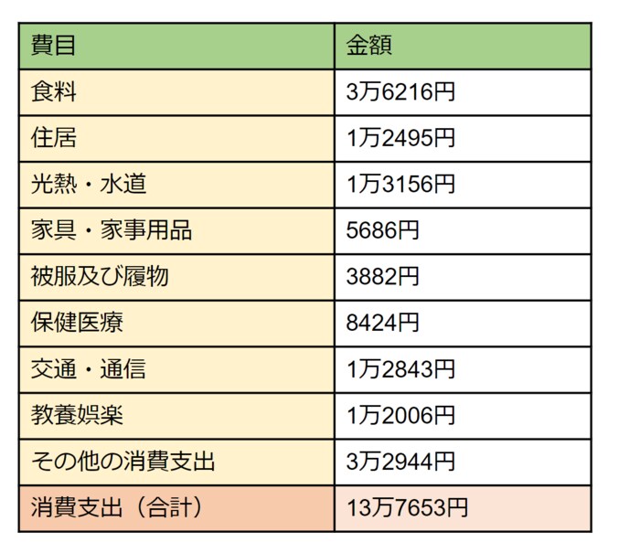 食費3万6216円、住居費1万2495円、水道光熱費1万3156円、交通・通信費1万2843円など、1カ月の支出を合計すると13万7653円になります。