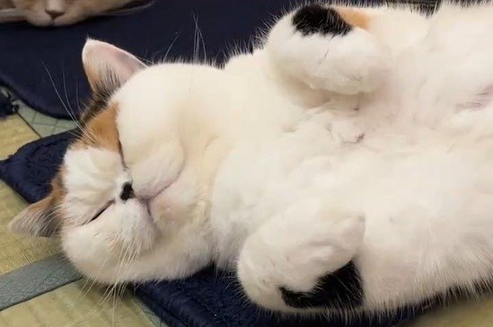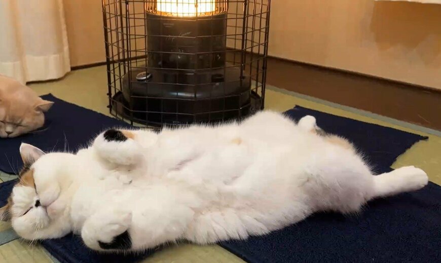 モフモフのお腹を大胆に見せたへそ天状態でストーブの前に横たわっています。まるで溶けてしまったかのようにリラックスする姿がなんとも愛らしいです……!