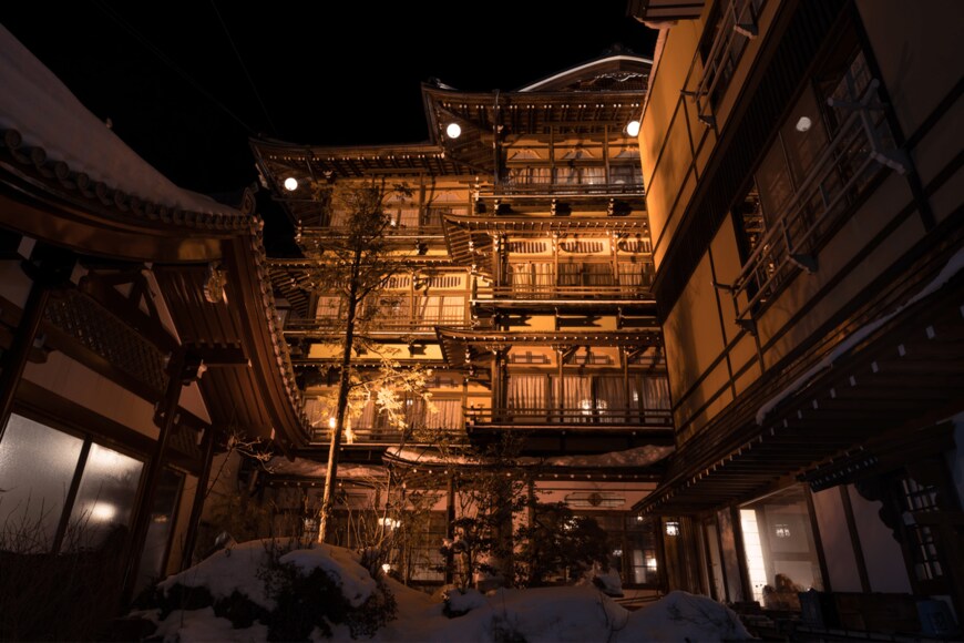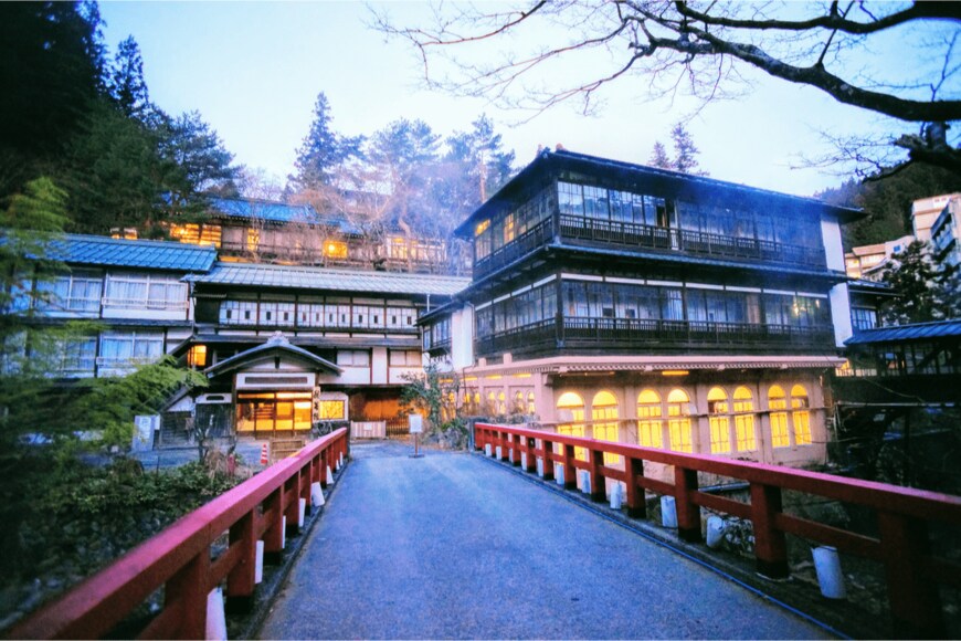さらに銀山川を挟んで立ち並ぶ木造旅館は情緒あふれ、木製の格子窓や外壁のしっくい、ガス灯の街灯がともる光景は、昭和初期にタイムスリップしたかのよう。銀山川のほとりを散策しながら湯めぐりを楽しむのがおすすめです。