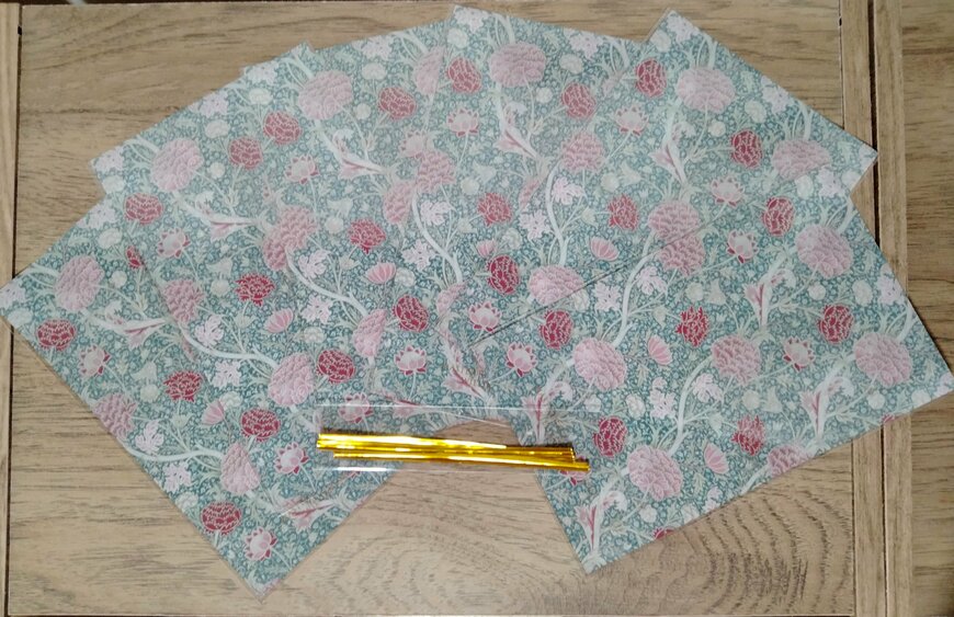 こちらがセリアで販売されている「クリアバッグ」です。モリスのデザインが使われたクリアバッグと、ゴールドのタイが素敵なアイテムです。