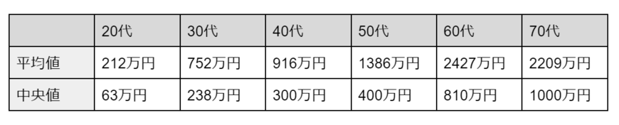 家計の金融行動に関する世論調査には、各世代の平均貯蓄額と中央値の調査も報告されています。各数値を一覧表にまとめてみました。