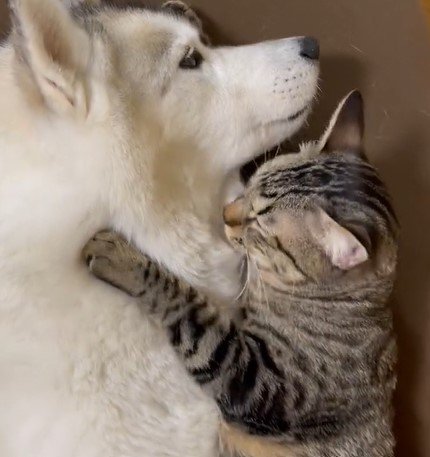 しばらく眠っていた様子のサンくんでしたが、ユキちゃんから顔を離してポジションチェンジ。ユキちゃんのほっぺに残るサンくんの顔の跡からは、ふたりがギューッと密着していたことが伝わってきます……!