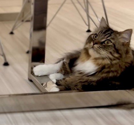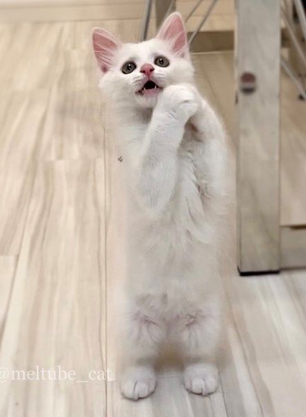 写真に写っているのは、子猫の頃のマオくんのようです。真ん丸の瞳で上方に視線を送る表情が、たまらなく愛おしいです……!2本足で上手にバランスをとりながら、顔の横で両手を合わせる仕草もチャーミング。