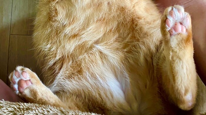飼い主さんの足の間でゴロンとしているようですが、その様子に警戒心は微塵も感じられません……!「撫でて」と言わんばかりのくつろぎぶりが可愛くて、思わず笑みがこぼれてしまいます。