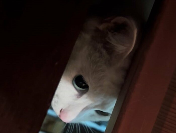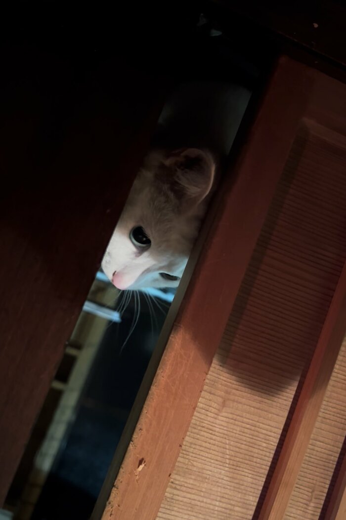 しかしこの日は、陰影や絶妙な覗き方も相まってか、写真では少々ホラーな雰囲気が感じられる姿に……!猫ちゃんは隙間から顔を覗かせ、横目で室内の様子を確認している様子。その姿はまるで、存在に気がつかれないように身を潜め、何か獲物に狙いを定めているかのようです。
