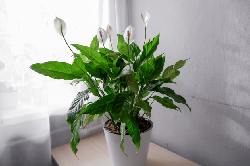 白く清楚な花を咲かせるスパティフィラム。花に見えるところは、実は苞と呼ばれる部分で花ではありません。