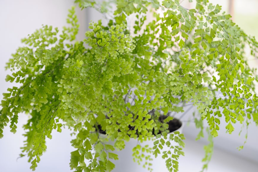 繊細な小葉が涼しげなアジアンタムはシダ植物の多年草。明るい日陰が生育に適しており、多湿を好みます。空気が乾きやすいところは避け、ときどき霧吹きで加湿をするとよいでしょう。※参考価格:1000円前後(4号鉢)