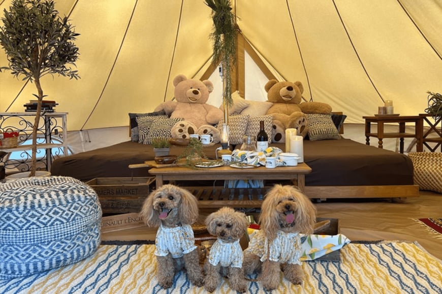 こちらではワンちゃんと一緒に泊まれる、プライベートドッグラン付きのテントを用意。また敷地内には広大なドッグラン、クラブハウス内にペットと楽しめるカフェや愛犬用のアイテムも多種販売しています。