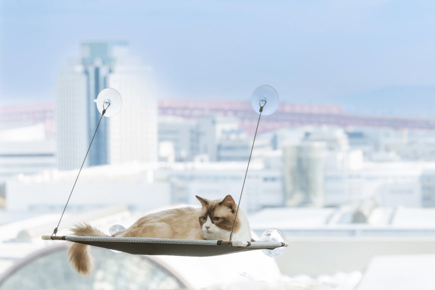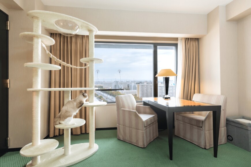 専用の客室には、愛猫用のアメニティとして大型キャットタワーやキャットハンモックを完備。外出するネコちゃんの緊張や不安を和らげるストレスフリーな空間を提供しています。