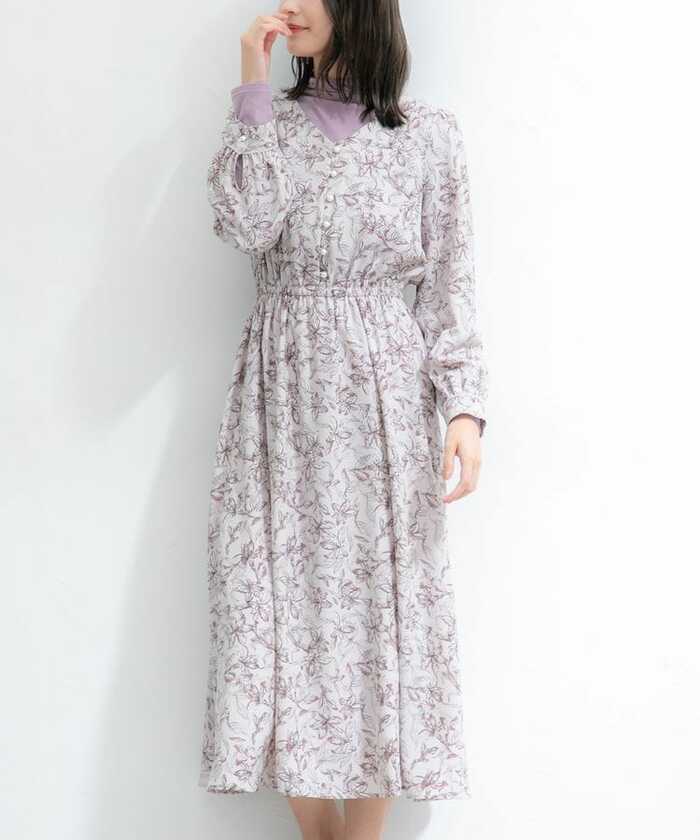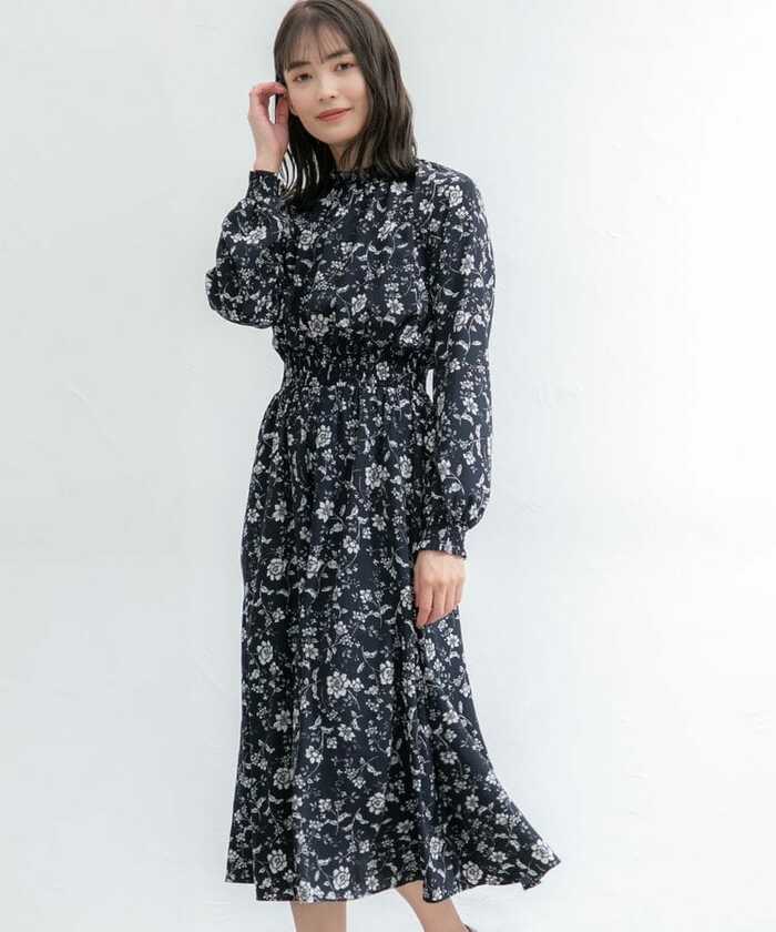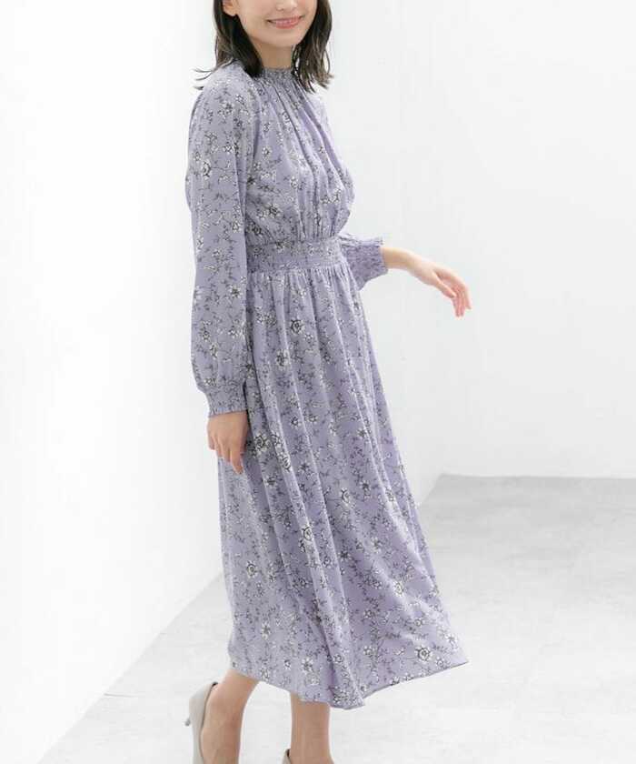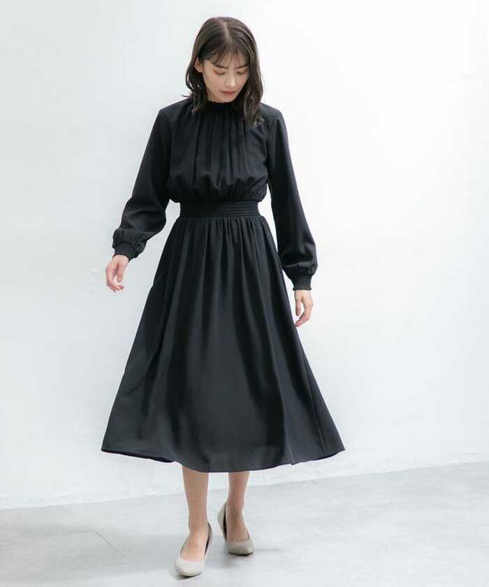 「ハイネックワンピース」はウエストに絞りの入ったロングスリーブのワンピースです。背中側で結ぶリボンがバックスタイルのアクセントになっています。インナーにハイネックのニットなどを合わせるのもおすすめです。