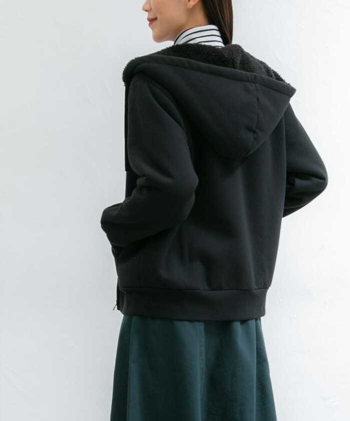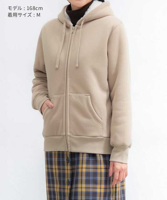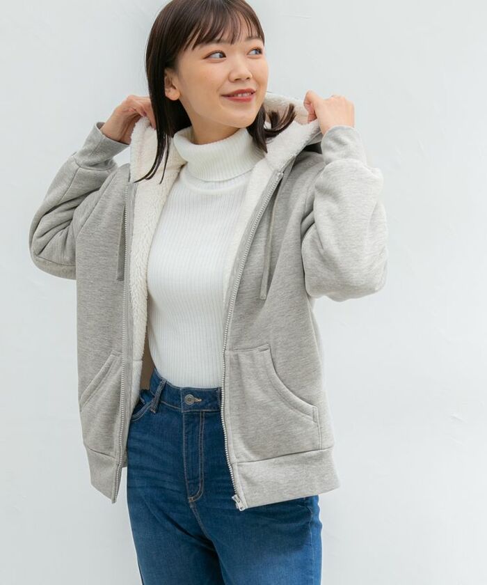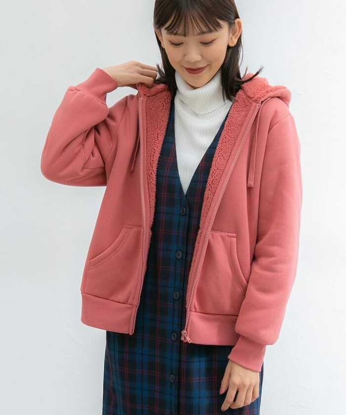 裏側にもこもこしたボアがたっぷり使われているジップアップパーカーです。「ハニぽか」アイテムの一つで、フードや袖にもしっかりボア素材が入っています。丈はあまり長くないため、スカートやパンツにも合わせやすいです。