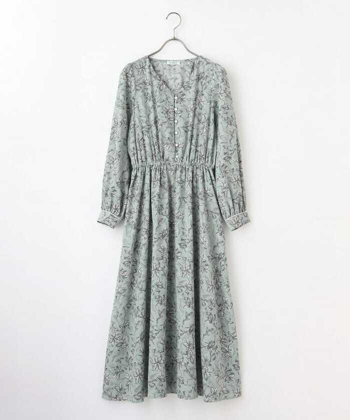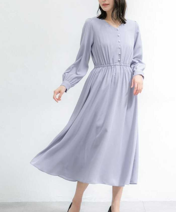 「パール釦使いワンピース」は華やいだ雰囲気のワンピースです。Vネックの下にはパールボタンが並び、華やいだ雰囲気をかもし出しています。