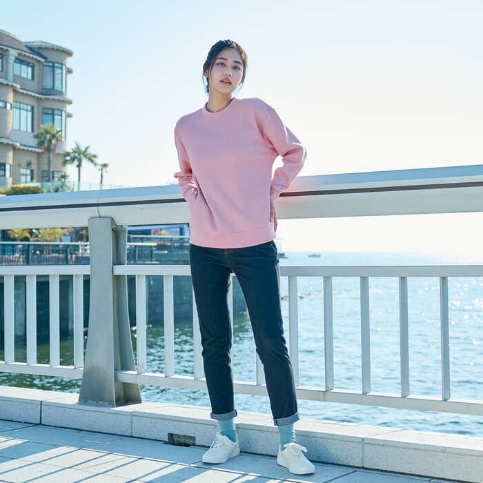 裏起毛でふわふわの着心地が特徴のレディーストップス。1枚で着ても映えるワッフル生地のシンプルなデザインで、スカートにもパンツにも合わせられます。サイドにはポケットが付いており、ちょっとした小物の収納に使えるところも便利です。