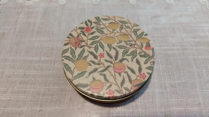 ウィリアム・モリスの上品なデザインが光る丸缶。キャンディやチョコレートなどのお菓子、薬、手芸アイテムといったちょっとした小物入れにぴったりのサイズです。バッグに入れても邪魔にならないので、持ち歩きにも良いでしょう。柄は、モリスの初期デザインで美しい果実と葉が描かれた「フルーツ」。