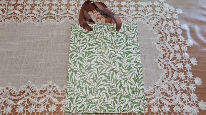 上品なグリーンが美しいウィリアム・モリスのハンドルバッグ。持ち手はブラウンのサテンリボンになっており、品の良い雰囲気です。コンパクトなサイズなので、小さな贈り物や手作りのお菓子などを入れるのにちょうど良いでしょう。柄は、上に向って枝葉を伸ばす柳を描いた「柳の枝」。甘い雰囲気の柄と異なり、爽やかな雰囲気の柄なので、ギフトバッグとして使用する際も性別や相手を選ばずに使用できます。