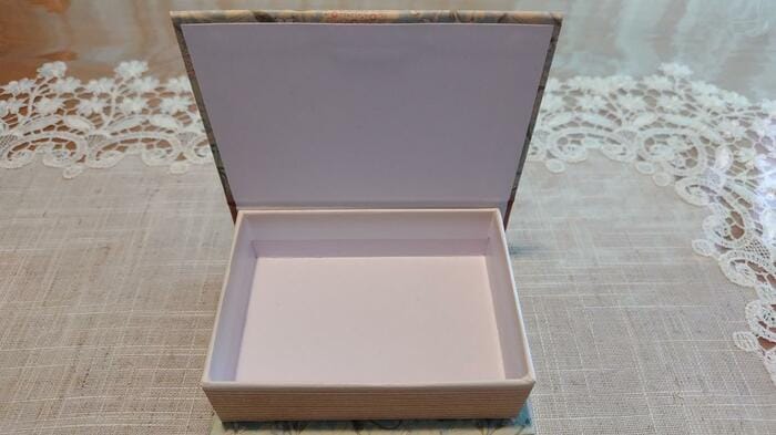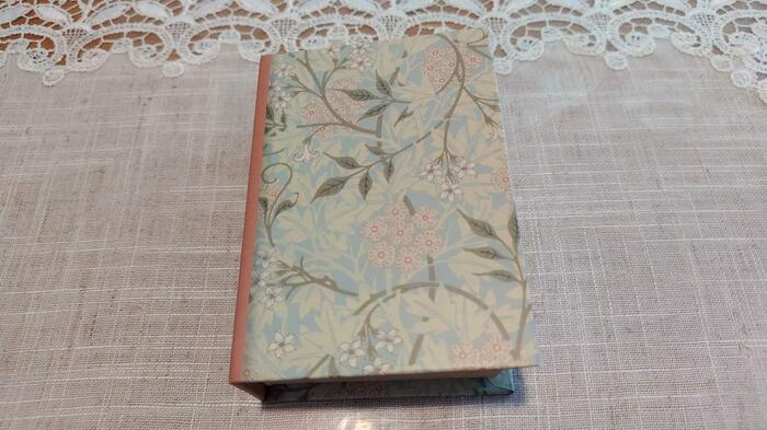 やわらかな色合いのブック型ボックス。側面は本の紙部分を模した柄になっており、細かな部分までこだわりを感じるデザインです。十分な厚みがあり、アクセサリーなどの小物を入れたり、ギフトボックスとして使用したりできます。
