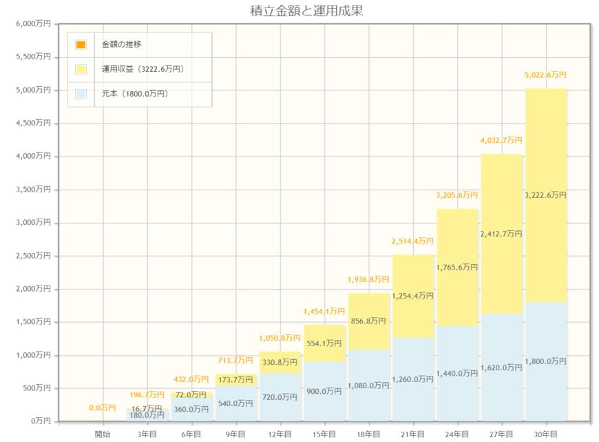 仮に、年率6%の複利で30年間運用することができた場合、毎月5万円を積み立てていけば、約5000万円の資産をつくることができます。