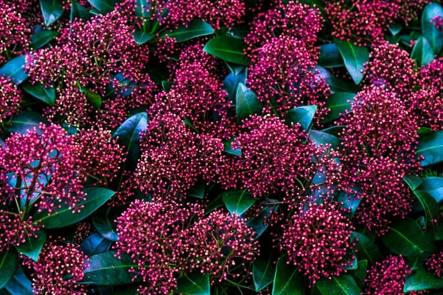 クリスマスローズの背後に植えたいのがスキミア。レッドやグリーンのツブツブの蕾が可愛らしい常緑低木です。冬にできる蕾はクリスマスローズをうまく引き立てます。※参考価格:1000~1500円前後(3~4号ポット苗)