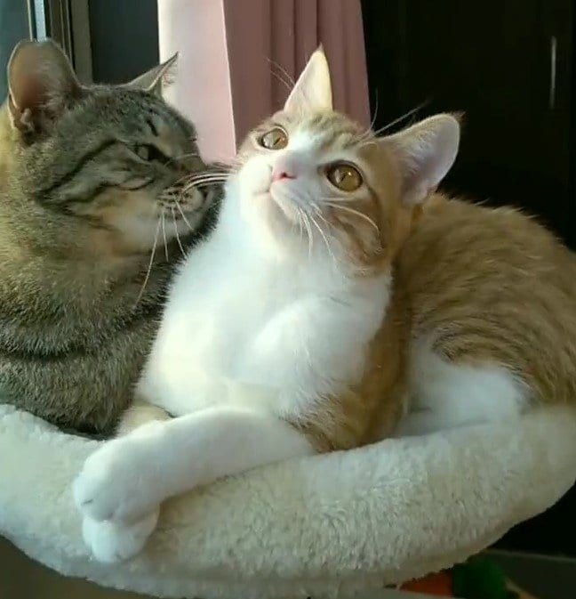 写っているのは、ひとつのキャットタワーにすっぽりとおさまる2匹の猫ちゃんです。