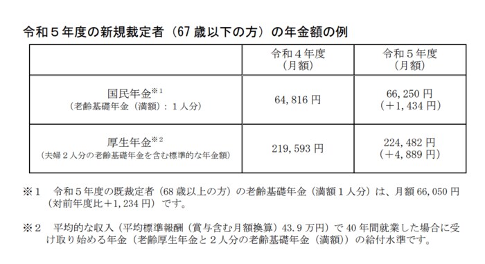 前年度と比べると、国民年金で1434円、厚生年金のモデル夫婦で4889円より上がっています。