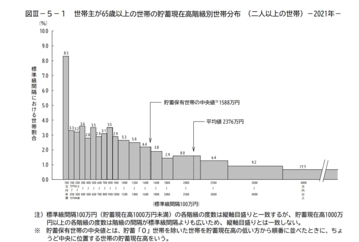まとまった貯蓄がある印象ですが、同調査による、65歳以上の全体の貯蓄分布は以下の通りです。