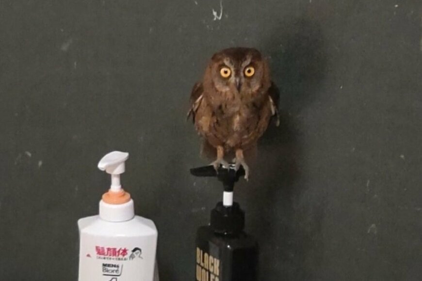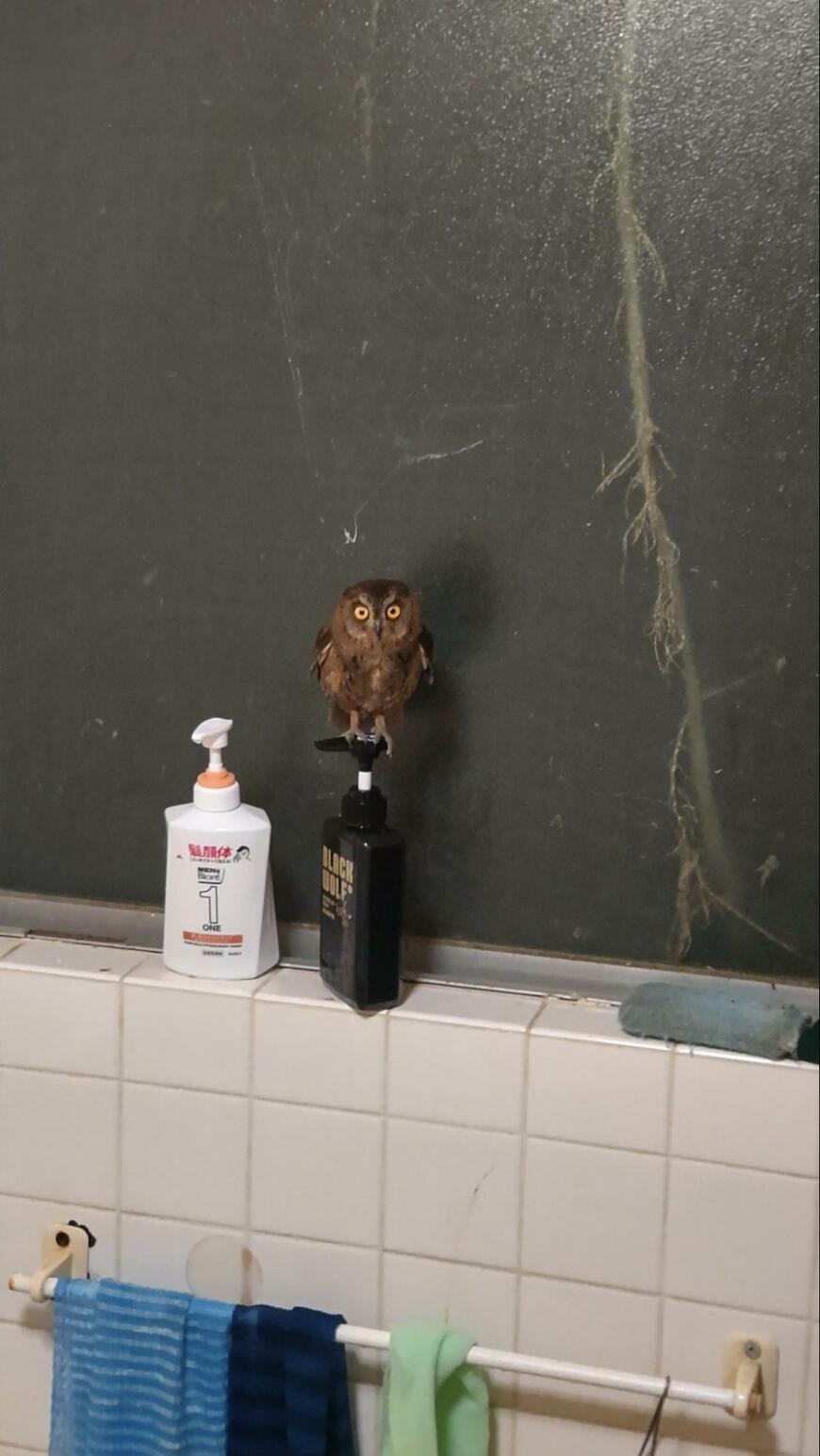 そこに収められていたのは、シャンプー容器の上にちょこんと佇むフクロウのような鳥。風呂場とフクロウというミスマッチな光景がなんともシュールです。何が起きているのか理解ができていないような、キョトンとした表情もかわいらしいですね。