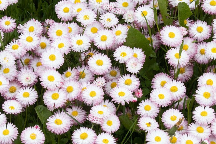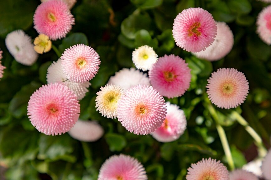 キク科のデージーは可愛らしい春の花。小さめの花はとても可憐で、特に丸い花形の品種はポップな雰囲気です。寄せ植えのアクセントになりますよ。