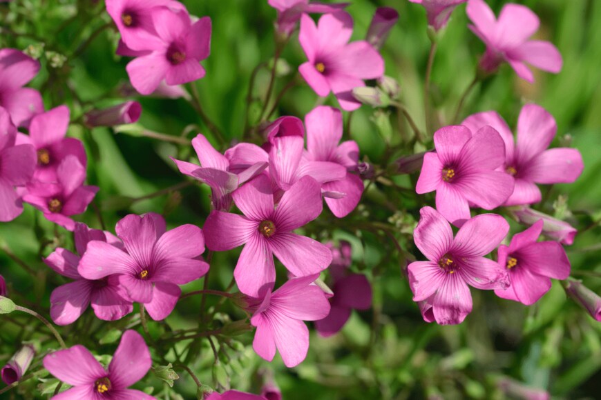 球根植物のオキザリスは、ホワイトやピンク、オレンジ色の花を咲かせる多年草。花つきがよく、集まって咲く花姿は見応えがあります。