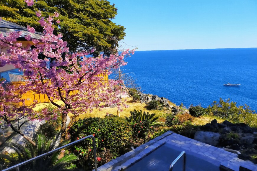 河津駅から車で約20分ほど、海沿いの北川温泉の高台に位置する隠れ家リゾート「吉祥CAREN」。2023年2月1日~4月28日の期間に「桜尽くしで温泉を愉しむ宿泊プラン」を販売しています。