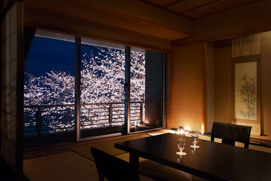 海を望む温泉露天風呂や客室など至る所で数種類の桜を満喫。ディナーにはフレンチ懐石のほか「桜カクテル」とスペシャリテ「桜の一皿」を用意。また館内の「吉祥スパ」では桜パウダーを使うエステの優待もありますよ。