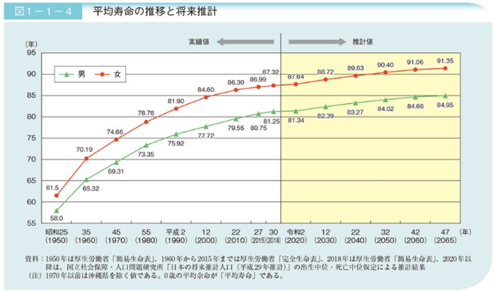 ただし、今後も男女とも平均寿命は延びて、令和47(2065)年には、男性84.95歳、女性91.35歳となることが見込まれています。