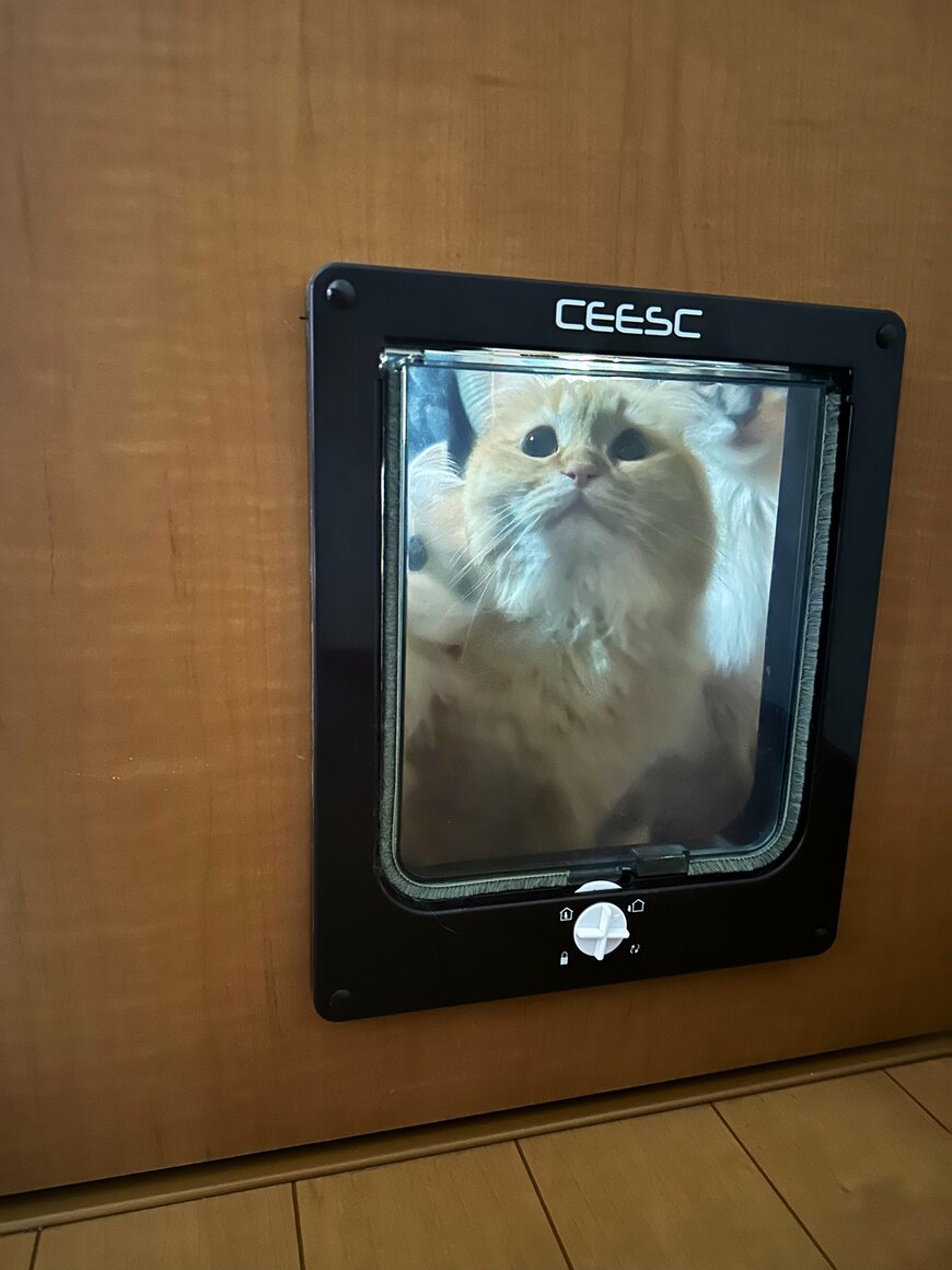 ドア下と思われる場所に設置された小窓を見てみると……?そこから見えるのは、3匹の猫ちゃん達が密集する姿でした。