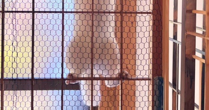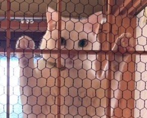 金網をよじ登る猫さんの表情をよく見てみると、ピンと耳を立てて「カッ!」と目を見開いています。