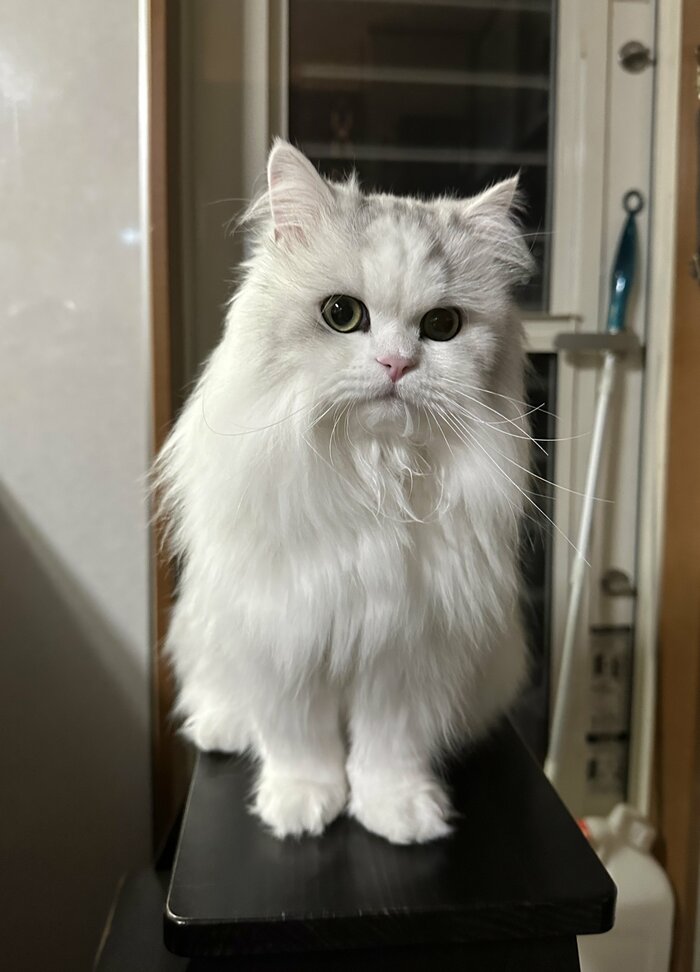 1枚目の写真には、ちょこんと座るノーマンくんの姿がありました。とってもキレイな真っ白の毛並みが印象的です。