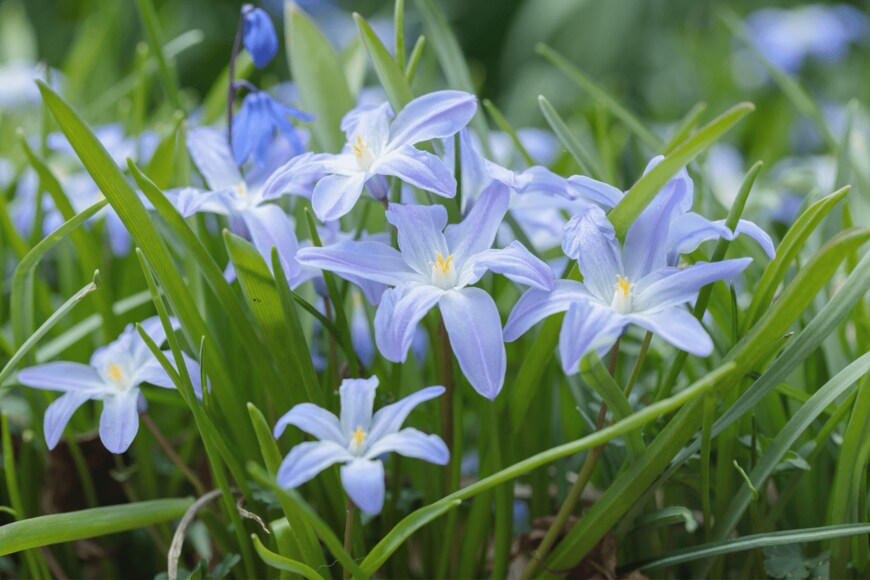チオノドクサはカワイイ星形の花が魅力的。花弁にはツヤがあるので、光が当たるとキラキラと星が輝いているかのようです。秋植え球根で植えっぱなしでも大丈夫。多くの球根をまとめ植えして、群植させるのがオススメです。