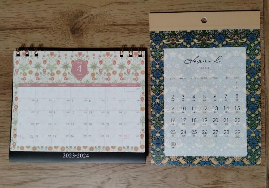 こちらがセリアで販売されている「モリスデザインのカレンダー」です。置き型(写真左)と壁掛け式(写真右)の2種類があります。