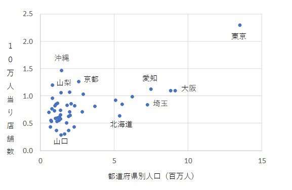 では次に、各都道府県における10万人当たりの店舗数を見てみましょう。