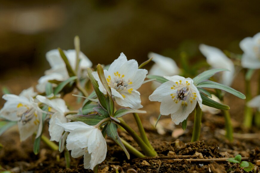 クリスマスローズと風合いが似た、星形の小花を咲かせるセツブンソウ。節分後の2月中旬~4月にかけて開花する多年草で、花びらに見える白い萼片×黄色の蜜弁のコントラストがキュートな植物です。