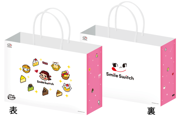 会場にて、税込2000円以上購入した方にオリジナルピクセルデザインのペコちゃんとケーキがプリントされた限定ショッパーをプレゼントしています。また、こちらは税込165円で販売も行っています。数量限定なのでなくなり次第終了です。