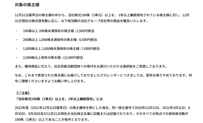 JTは「12月31日基準日」の株主の中から、株式100株(1単元)以上を1年以上継続保有している株主に対し、優待を提供しています。