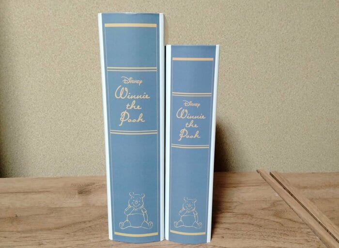 ダイソーのプーさんのブック型ボックスは、どこから見ても本のようです。