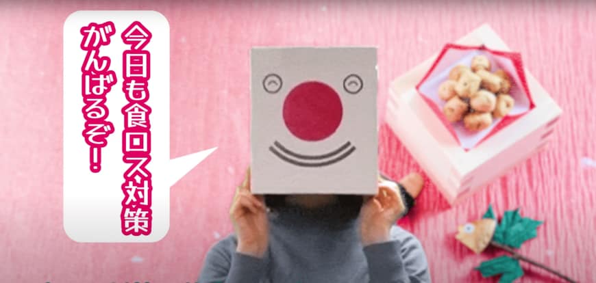続いて紹介されたのは、食ロス(食品ロス)対策の仕事として、”ろすのん”の顔をかぶる職員さんの姿です。